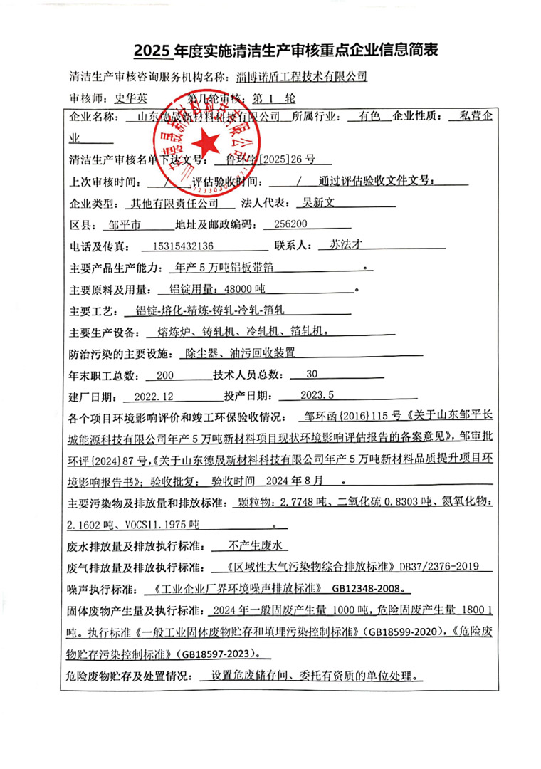 山东德晟新材料科技有限公司第一轮清洁生产审核信息公示
