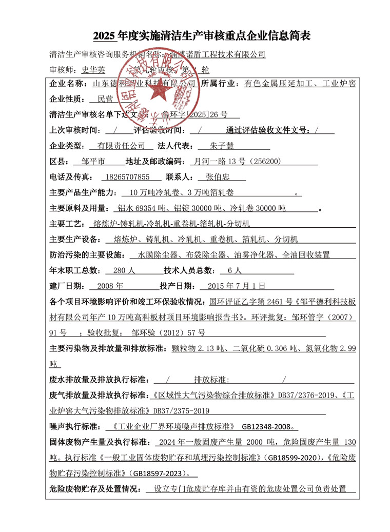 山东德利铝业科技有限公司第一轮清洁生产审核信息公示